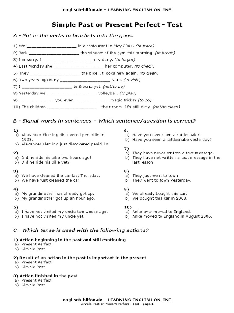 Test Present Perfect En Pdf Englisch Hilfen De Learning English Online Present Perfect Test A Put In The Correct Verb Forms 1 They Listened A Has B Course Hero