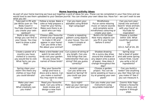 Home Learning Activities Outdoor Learning Teaching Resources